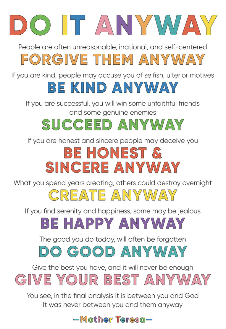 And pertaining to worldly affairs and personal conduct, Mother Teresa offered similar guidance: