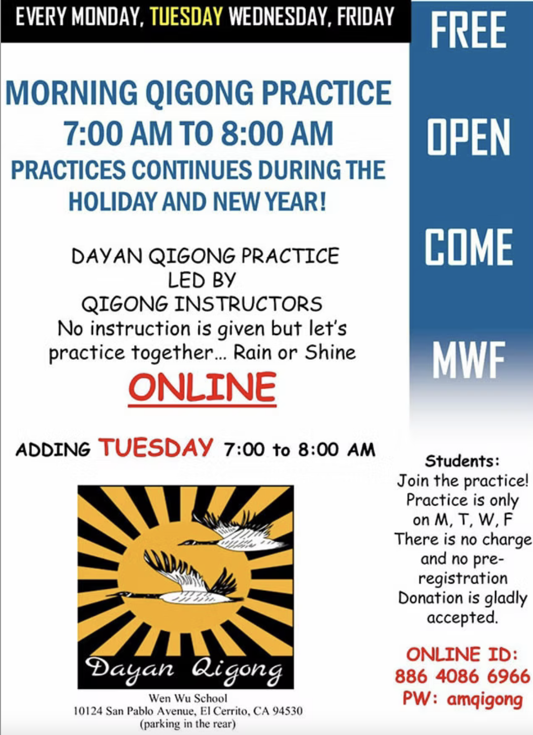 The Wen Wu School Dayan Qigong group practices umbrella is quite expansive these days, and ever growing. Check out the Wellness Community section of this website to find In-person and Online practices available seven days a week.