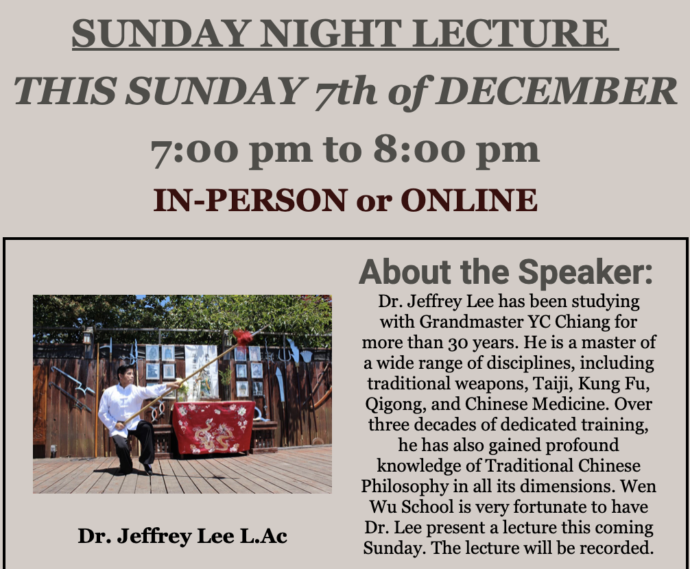 Don’t miss Loc Huynh kicking off Wen Wu School’s monthly, first Sunday Lecture series, 7:00-8:00 PM (PST).